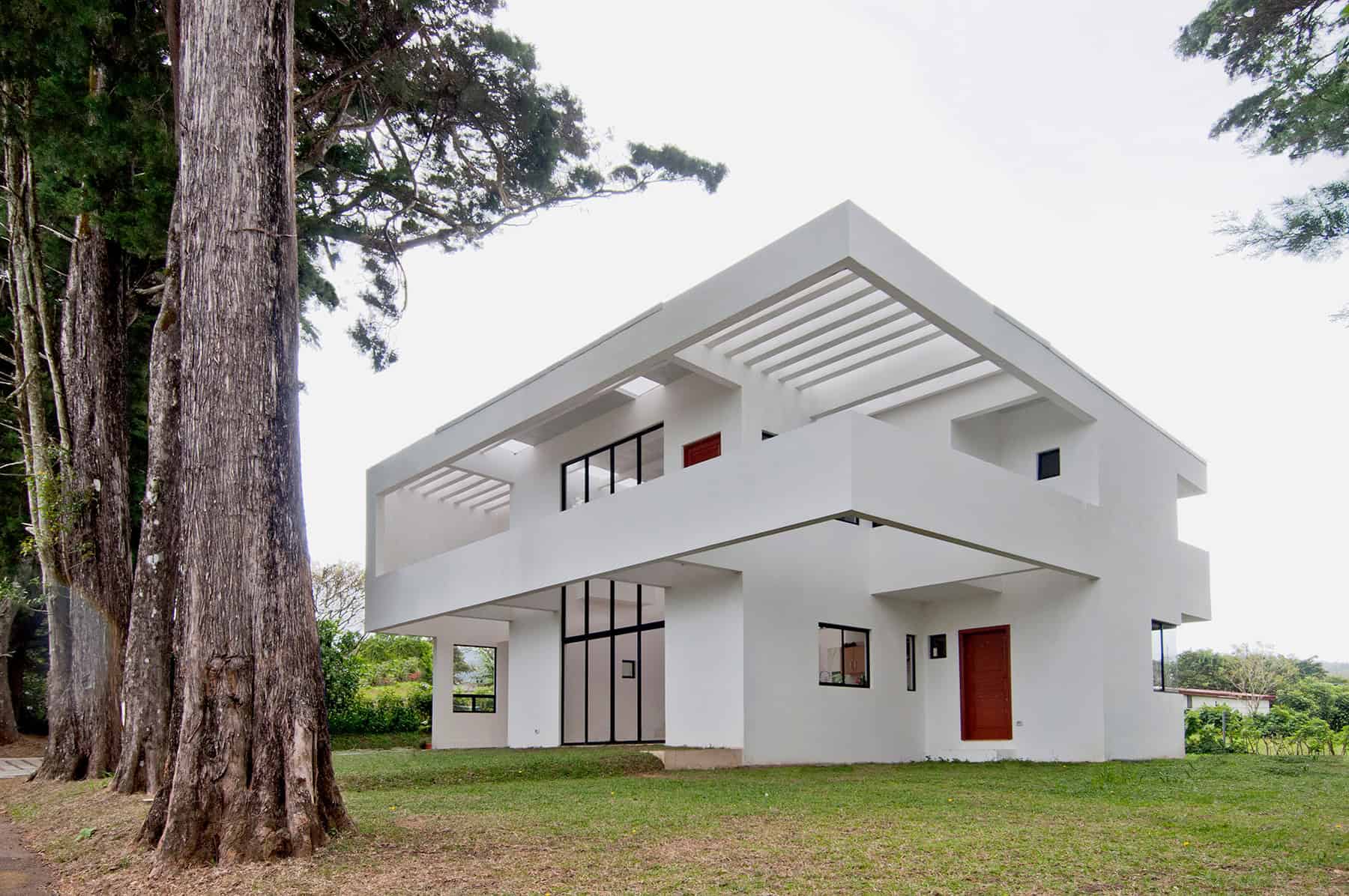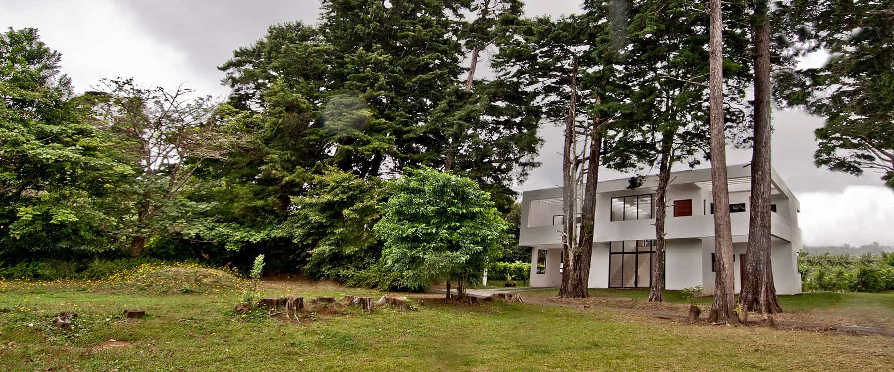 La Casa de Montaña se implanta en un terreno bordeado por cipreses de gran altura, propios de la zona montañosa de Barva. La distancia entre esos árboles perimetrales determinó la modulación de la vivienda — la geometría del lugar se convierte en la medida del proyecto.