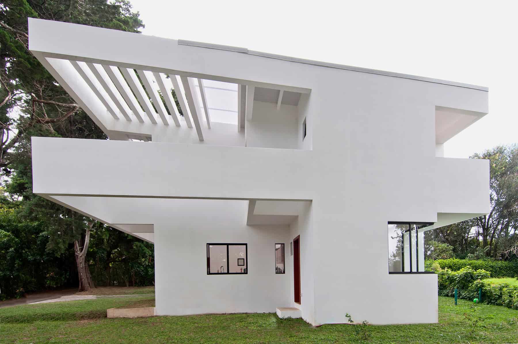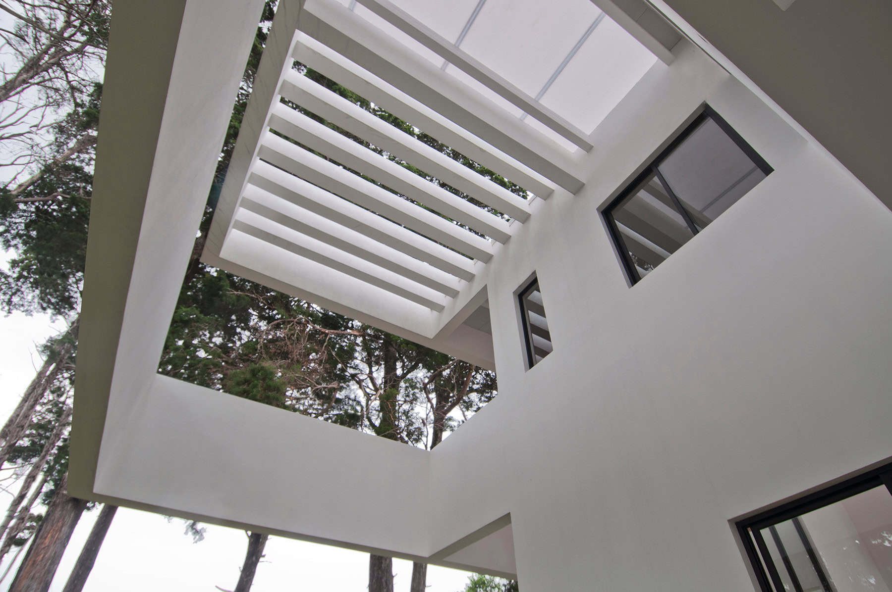 El clima frío, lluvioso y ventoso de Barva orienta las decisiones de habitabilidad: espacios internos claros, calidez a través del mobiliario en madera y ventilación cruzada controlada. La luz natural es el instrumento principal — genera un juego permanente entre espacios abiertos y espacios de recogimiento, y mantiene la casa en diálogo constante con su paisaje. El blanco celebra ese entorno y contrasta con las sombras de las pérgolas.