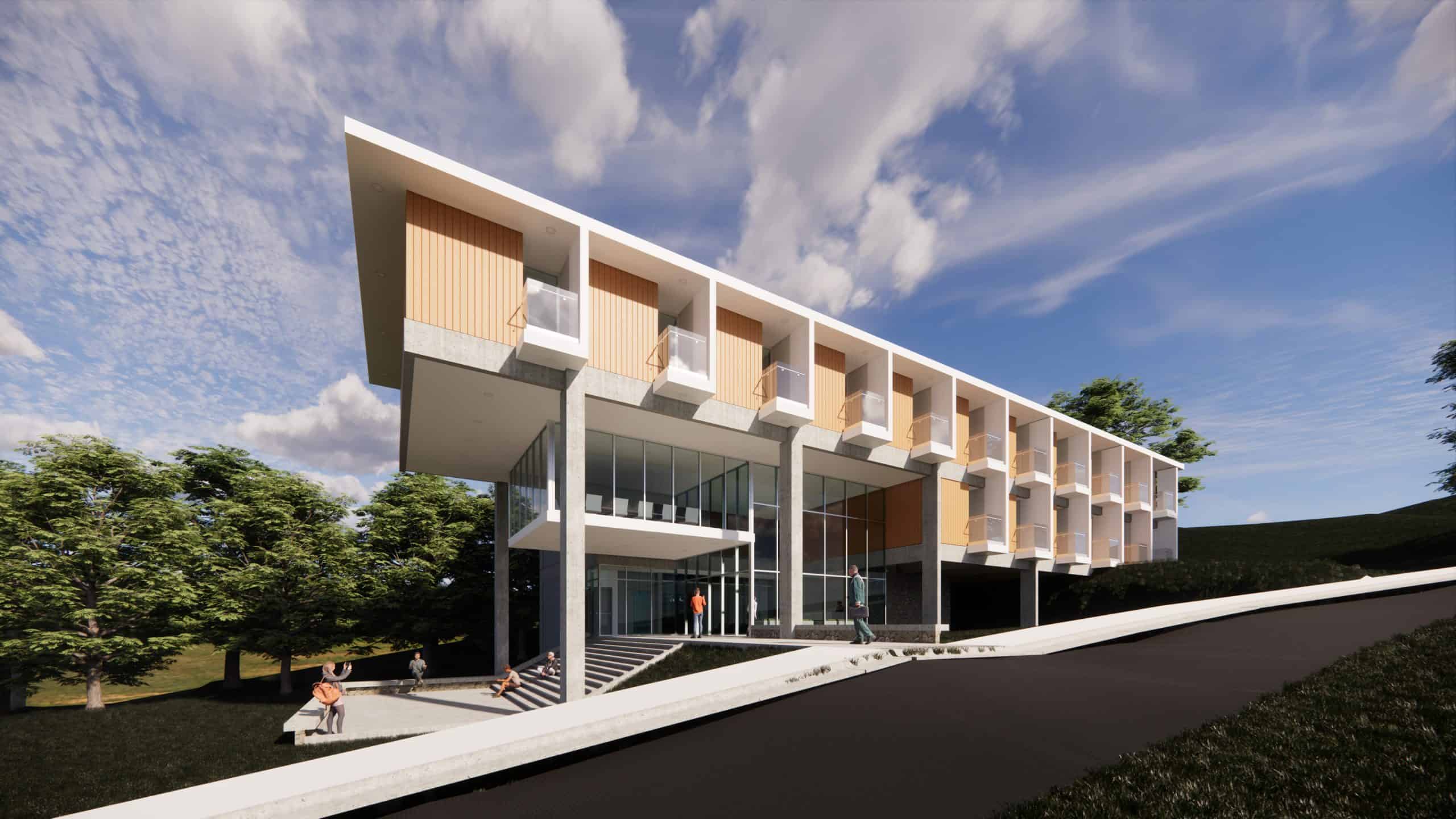 El Centro de Hospedaje en Tres Ríos se implanta en un entorno montañoso de clima nuboso, con capacidad para 180 personas. La volumetría responde a la topografía y orienta los dormitorios para maximizar la luz natural y enmarcar las vistas hacia el bosque. Cada habitación tiene balcón privado. Un pasillo central longitudinal potencia la ventilación cruzada y garantiza confort térmico sin sistemas mecánicos.