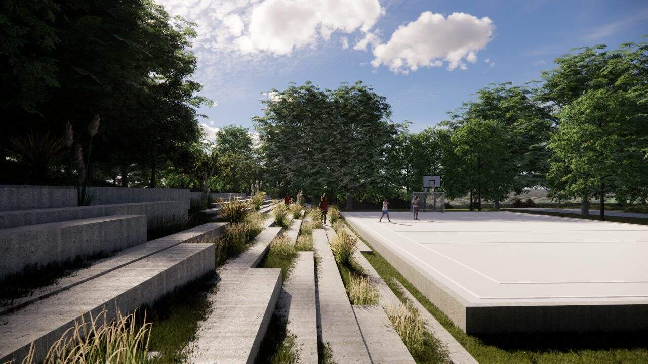 La Zona Central se divide en dos sectores. El sector norte concentra el edificio administrativo, un boulevard con muro curvo de piedra que abraza el paisaje y sirve de conector entre plazas y edificios, y una zona de estar bajo sombra arbórea con disposición de anfiteatro para grupos pequeños. El sector sur alberga el edificio de investigación horizontal de dos pisos abierto hacia una loma de césped, un puente semicircular en madera techada que conecta con la pared de escalada, y pasarelas en piedra natural con un balcón paisajístico centrado en la loma para contemplación y encuentro.