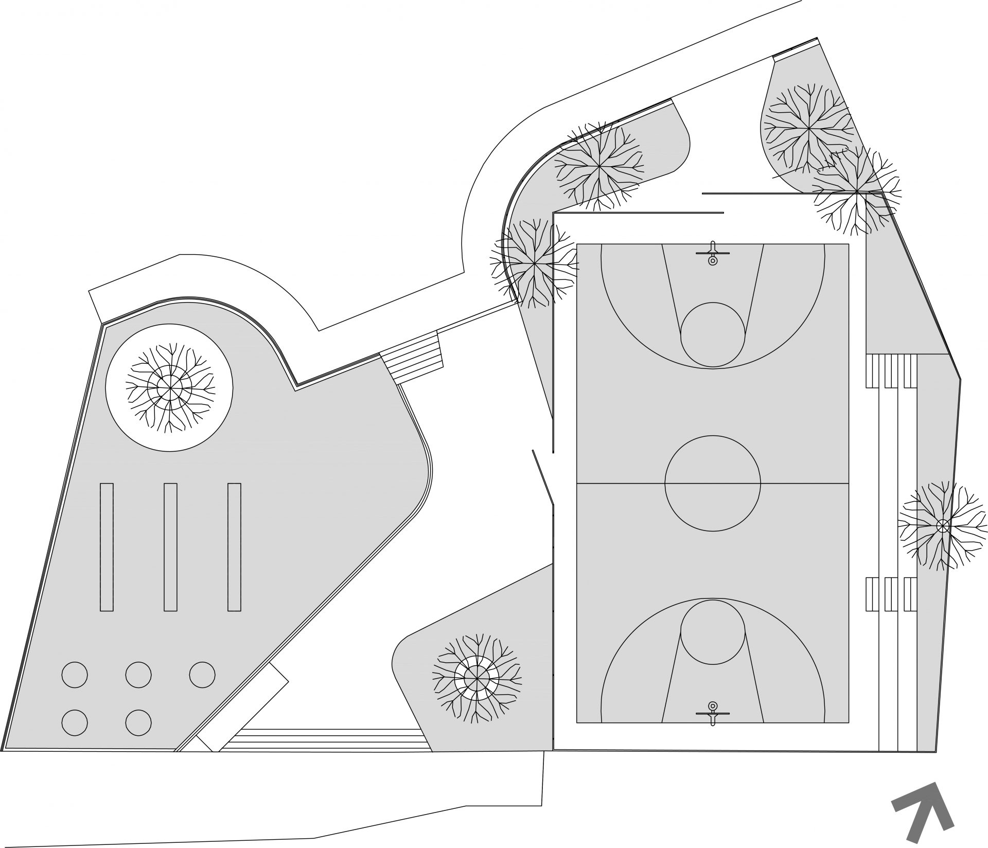 El trazado principal se organiza entre dos áreas complementarias: hacia el este, una cancha de uso múltiple; hacia el oeste, una zona de juegos infantiles. Ambos espacios se integran a través de una plataforma lineal sombreada por árboles existentes, que refuerza el carácter accesible y compartido del parque.